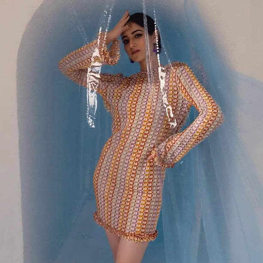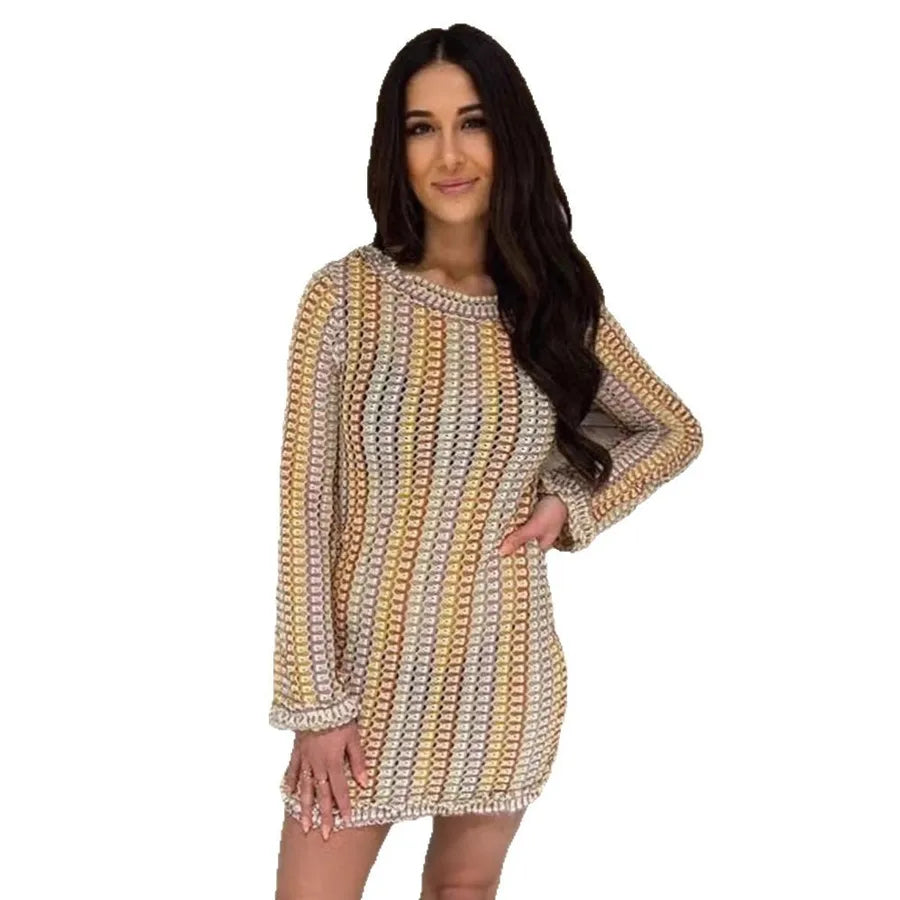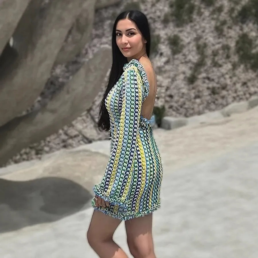 Summer New Sexy Backless Knitted Short Beach Cover Up Fashionable Elegant Long Sleeve Dress High Waist Bodycon Gown