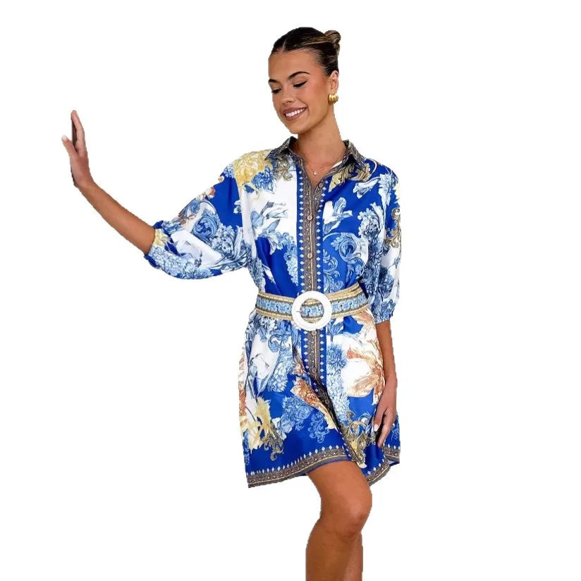 Summer Women's Fashion Floral Print Turn-down Collar Jacket Casual European Style High Waist Midi Dress Sleeveless Dress