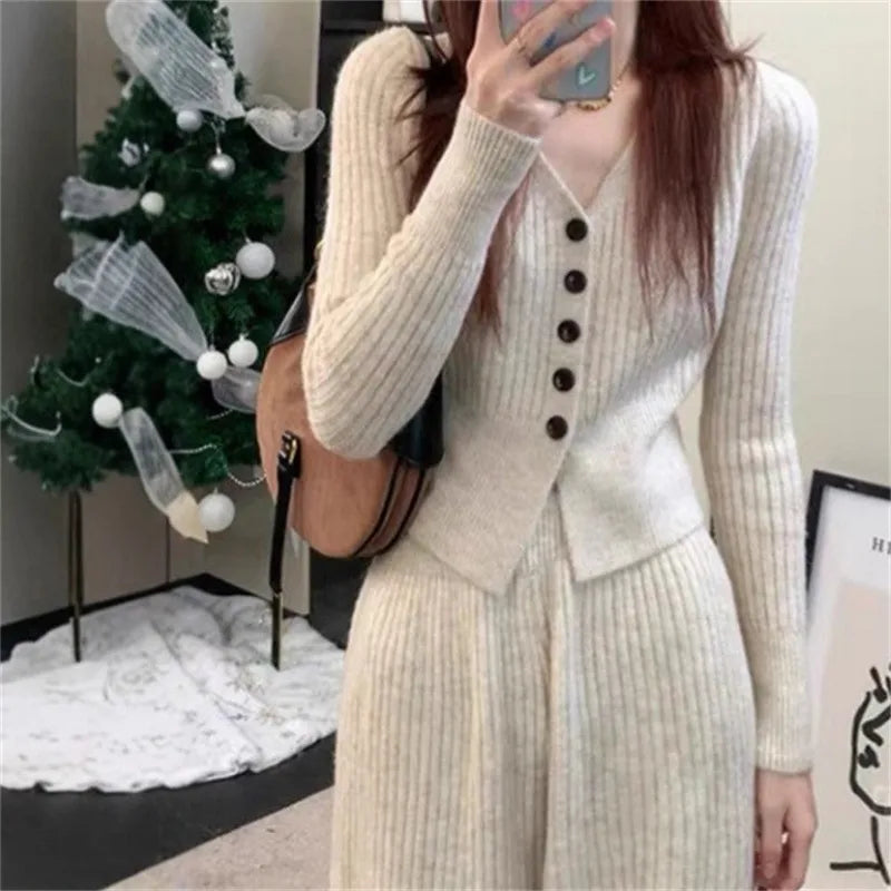Versatile V-Neck Open Cardigan Slim High Waist Knitted Sweater And Wide Leg Pants Women's Autumn Winter Fashion Casual Set