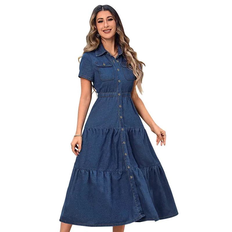 Wholesale Cowboy Style Streetwear Solid Color Holiday Street Turndown Short Sleeve Denim Dress