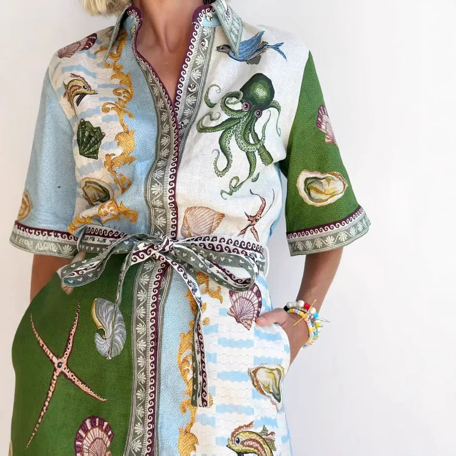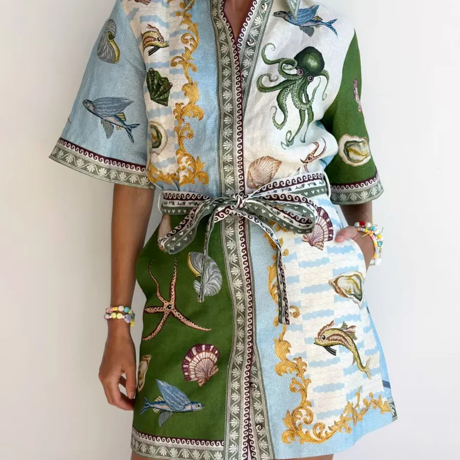 Wholesale Women's Elegant Marine Style Streetwear Shell Holiday Selfie Shirt Collar Short Sleeve A- Line Skirt