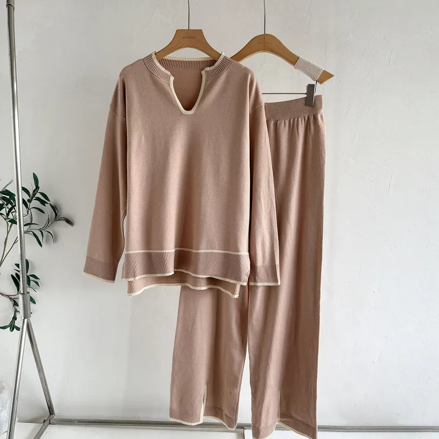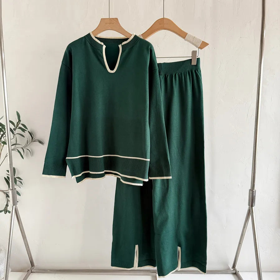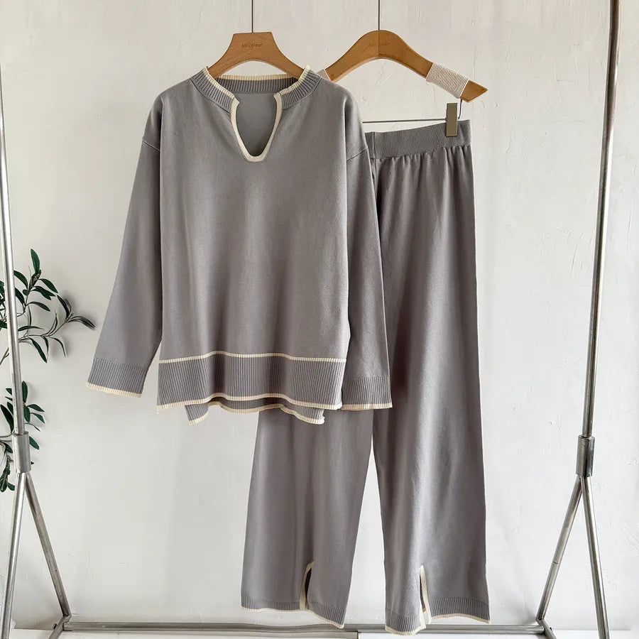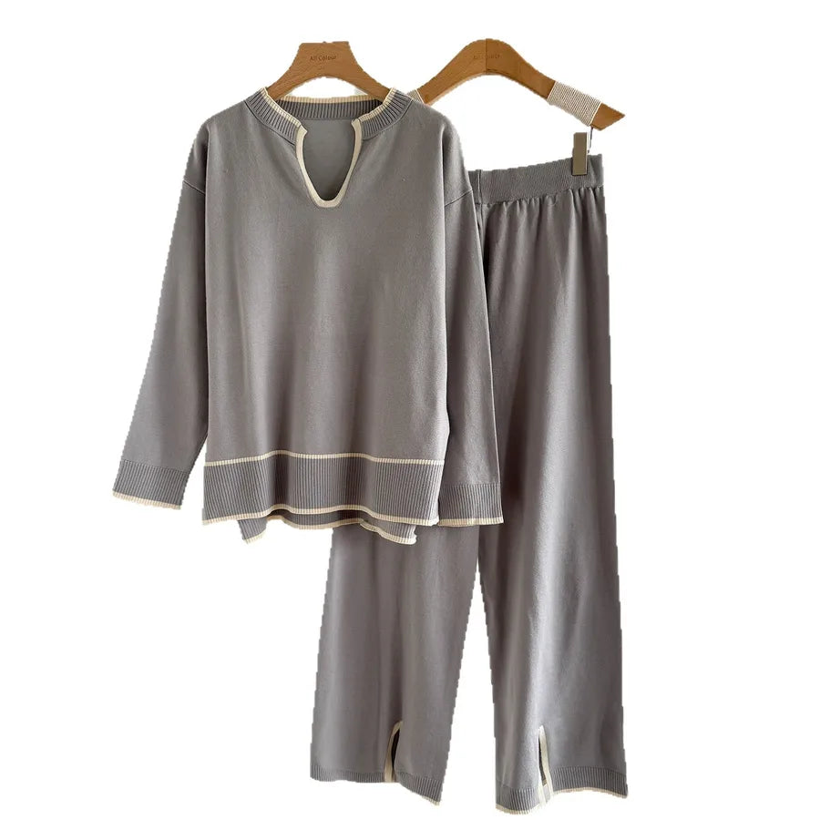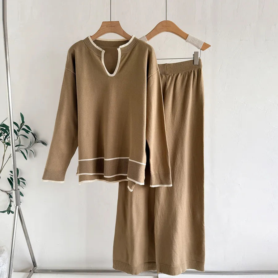 Women's Autumn Winter Knitted Sweater Set U-Neck Long Sleeve Wide Leg Pants Two-Piece Casual Fashion Ensemble Commute Style