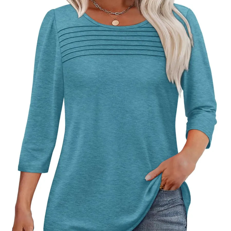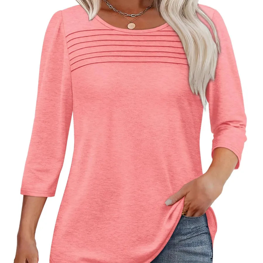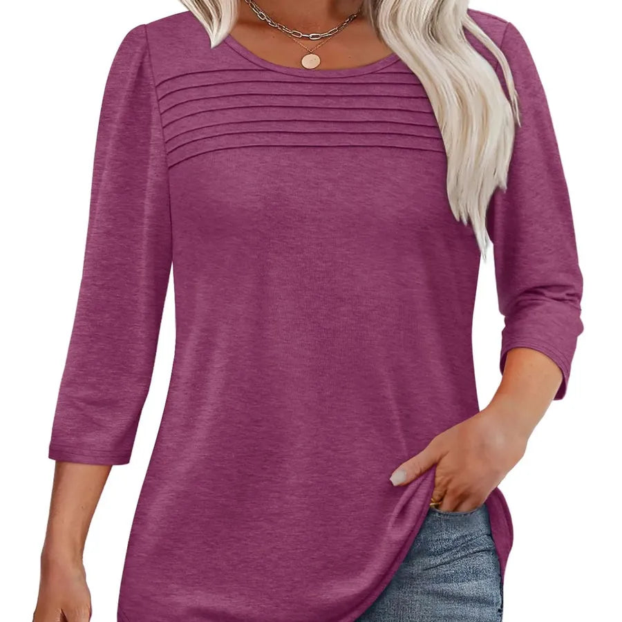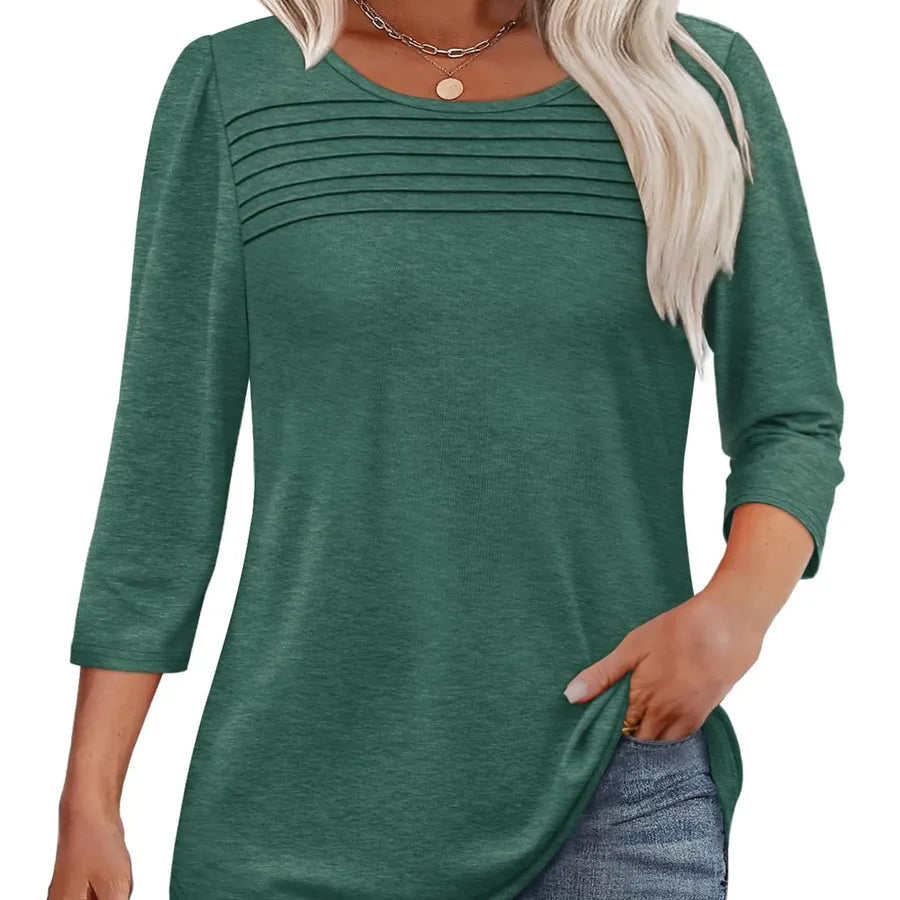 Women's Autumn Winter Round Neck Seven Sleeve Front Tuck Line Pleated Top European Style Street Fashion Loose Fit Cotton T-shirt