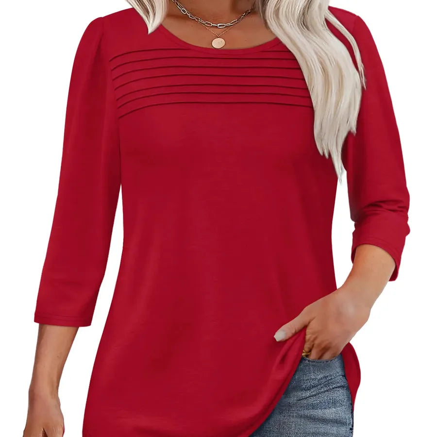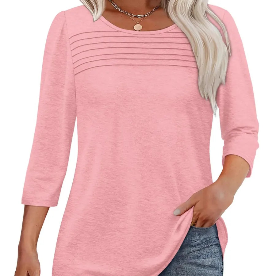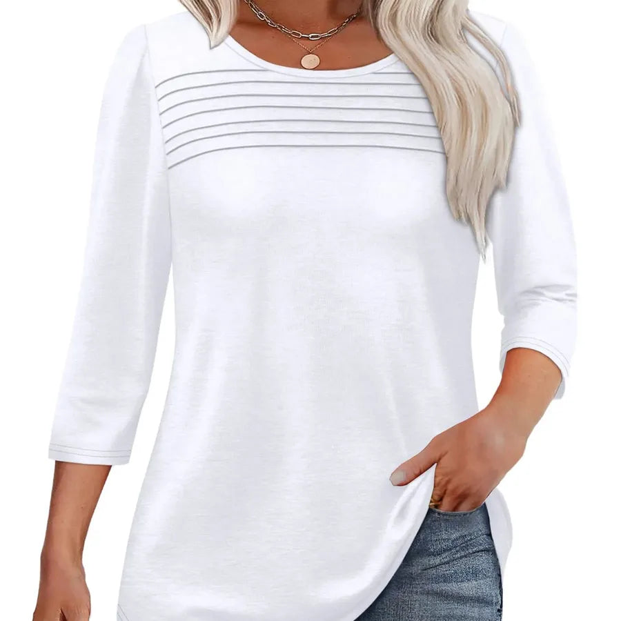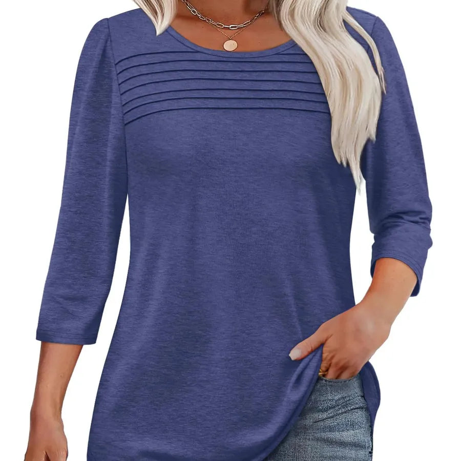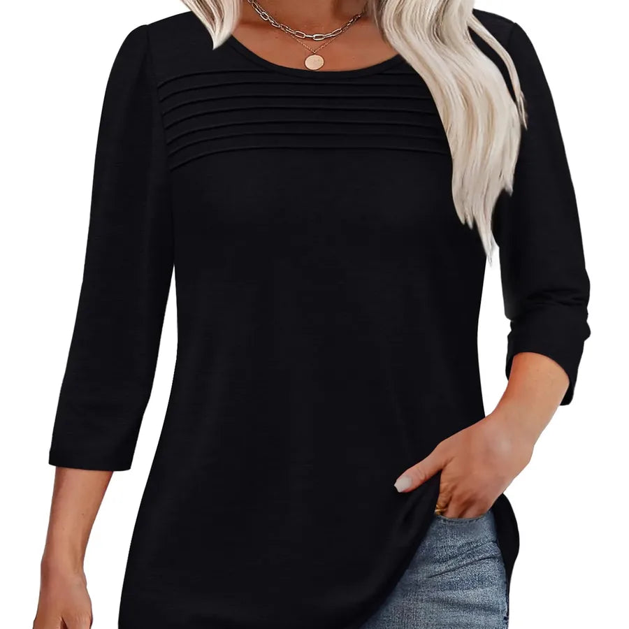 Women's Autumn Winter Round Neck Seven Sleeve Front Tuck Line Pleated Top European Style Street Fashion Loose Fit Cotton T-shirt