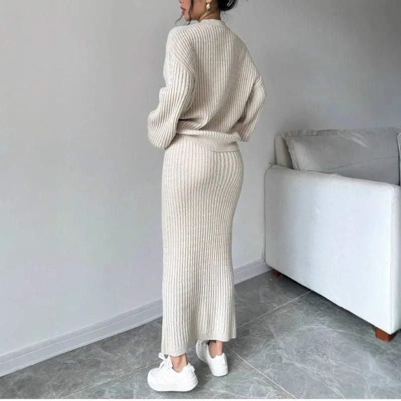 Women's Casual Long Sleeve Sweater and Skirt Set Solid Color 2-Piece Outfit Comfortable Breathable V-Neck Loose Fit Style