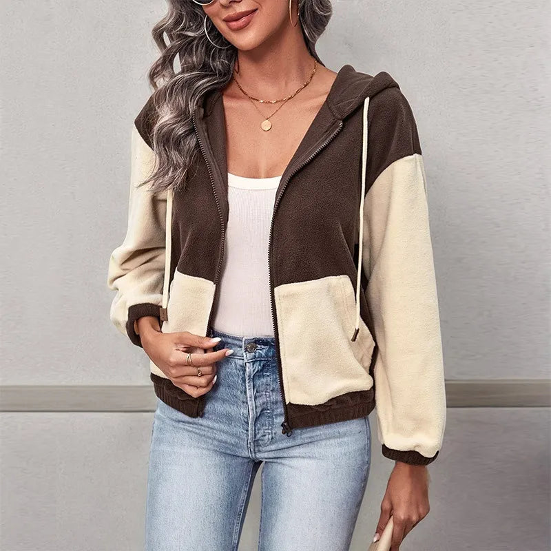 Women's Casual Style Zipper Hooded Patchwork Fleece Jacket Long Sleeve Sweatshirt Comfortable Breathable Regular Fit Outerwear