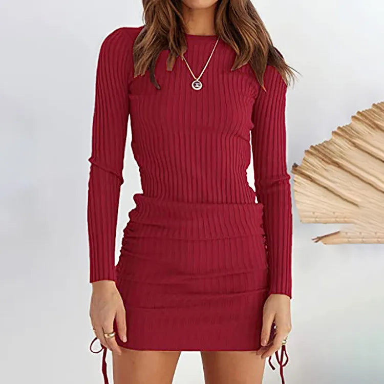 Women's Fall And Winter Fashion Casual Pleated Decorative Drawstring Knit Mid-waist Long-sleeved Dresses