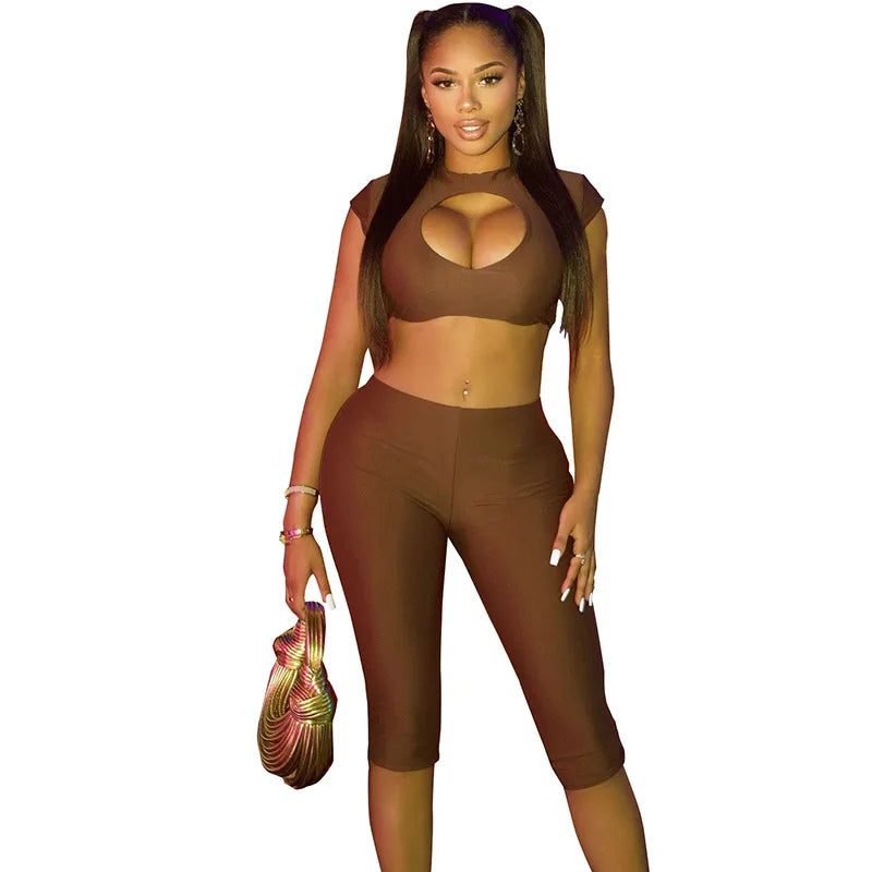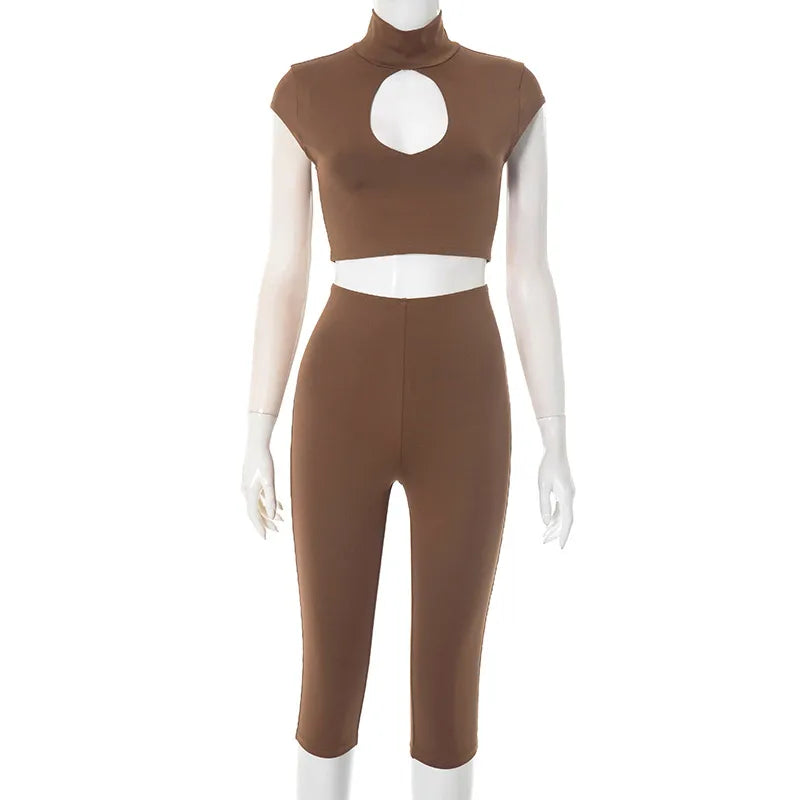 Women's Fashion Casual J25ST199 Top And Bottoms Set Round Neck Short Sleeve Hollow Out Crop Top And Seven Inch Long Pants