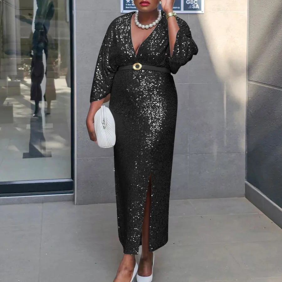 Women's Hip skirt Elegant V Neck Belt 3/4 Length Sleeve Solid Color Maxi Long Dress Daily