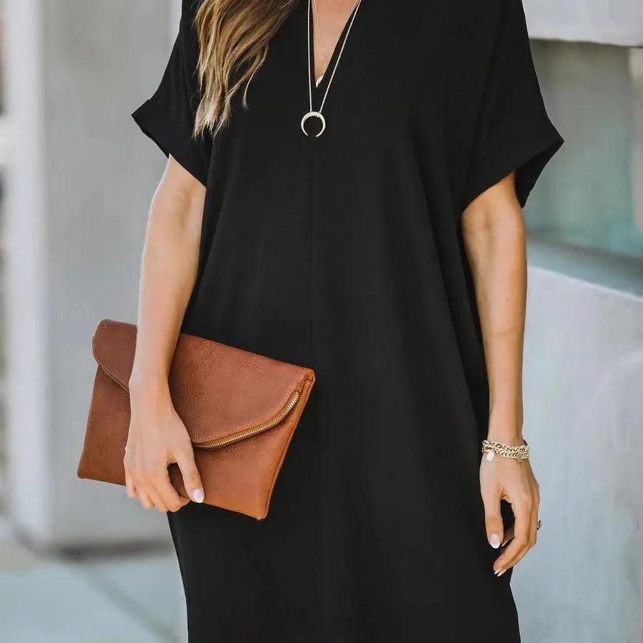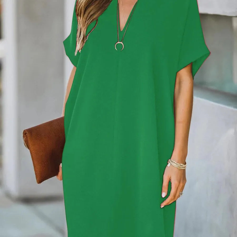 Women's Pure Color H-Shape Loose V-Neck Short Sleeve Home Clothes Dress Patchwork Dress Comfortable Breathable Casual Style