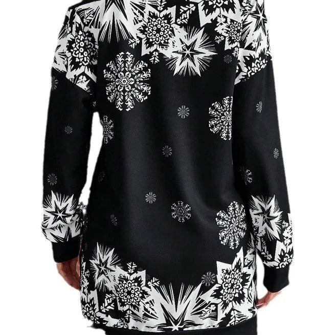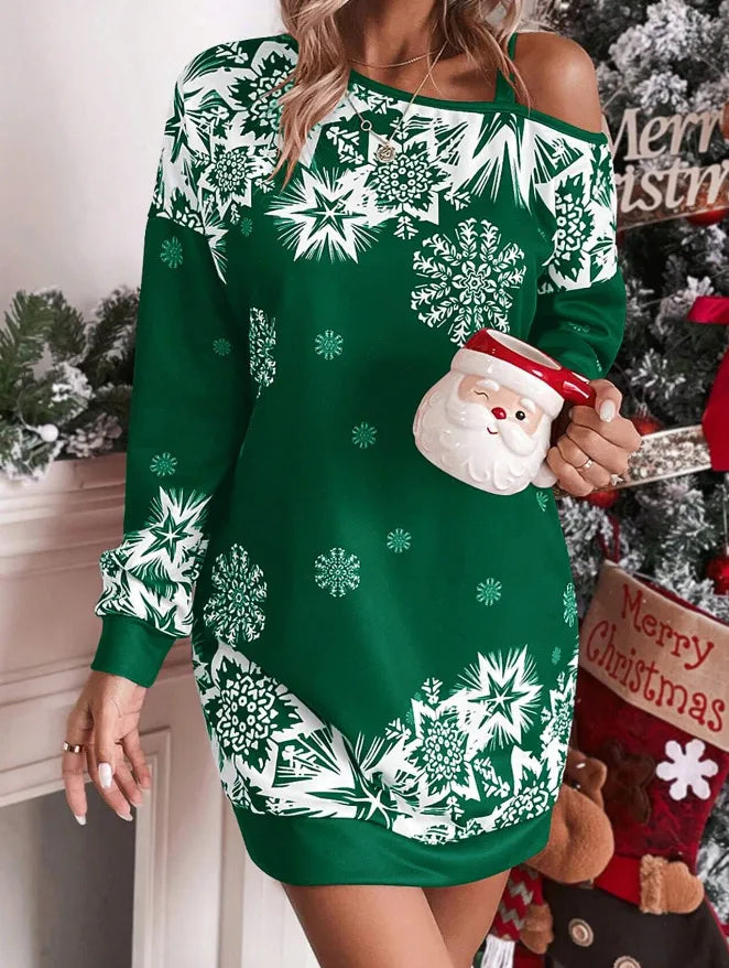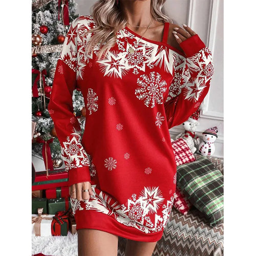 Women's Regular Dress Christmas Oblique collar Printing Long Sleeve Snowflake Above Knee Festival