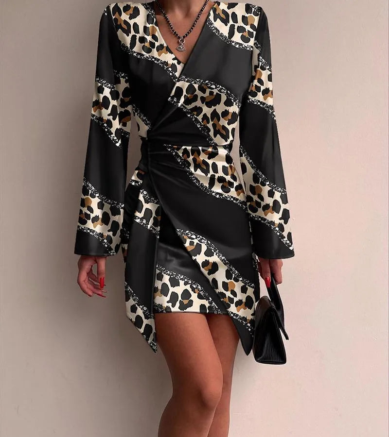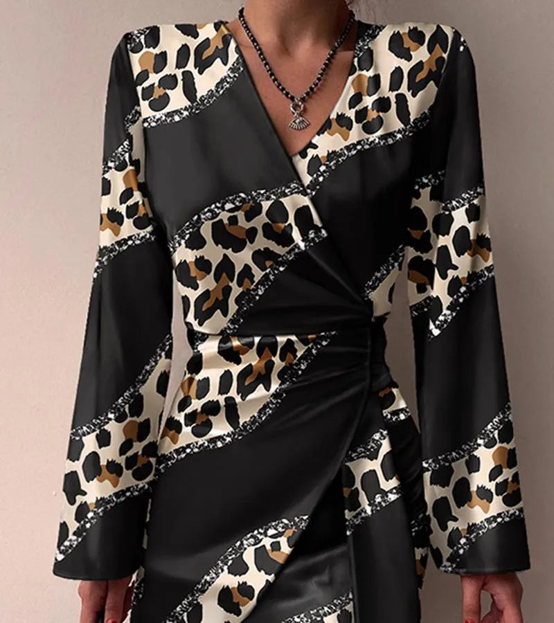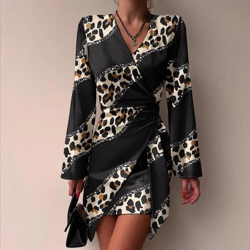 Women's Regular Dress Elegant V Neck Printing Long Sleeve Color Block Leopard Above Knee Holiday Date Bar
