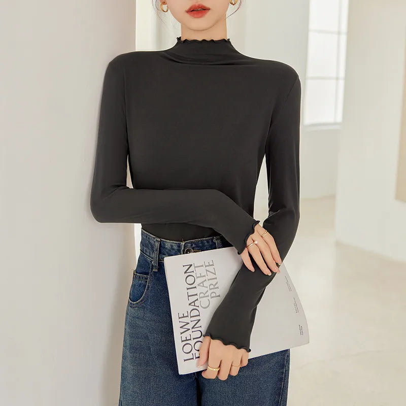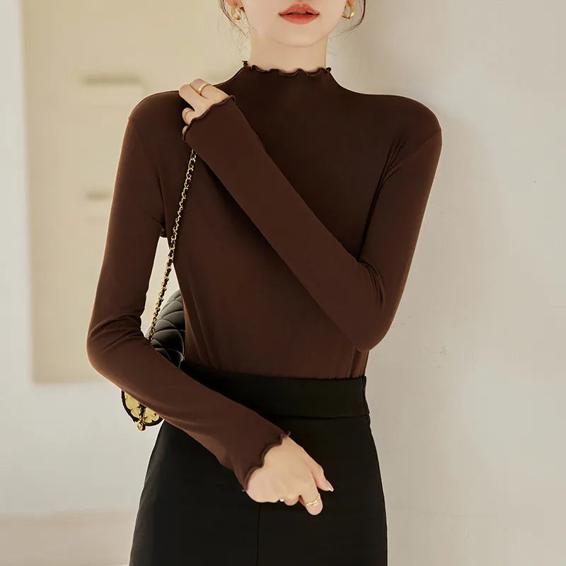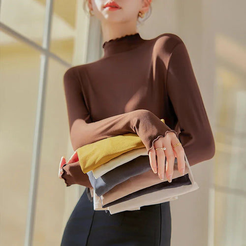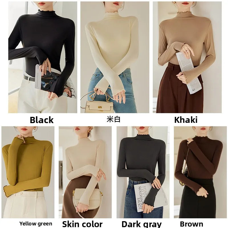 Women's Slim Fit Long Sleeve Base Shirt Autumn Winter New Style Coconut Oil Mask Inner Wear Wood Grain Edge Polyester Fiber
